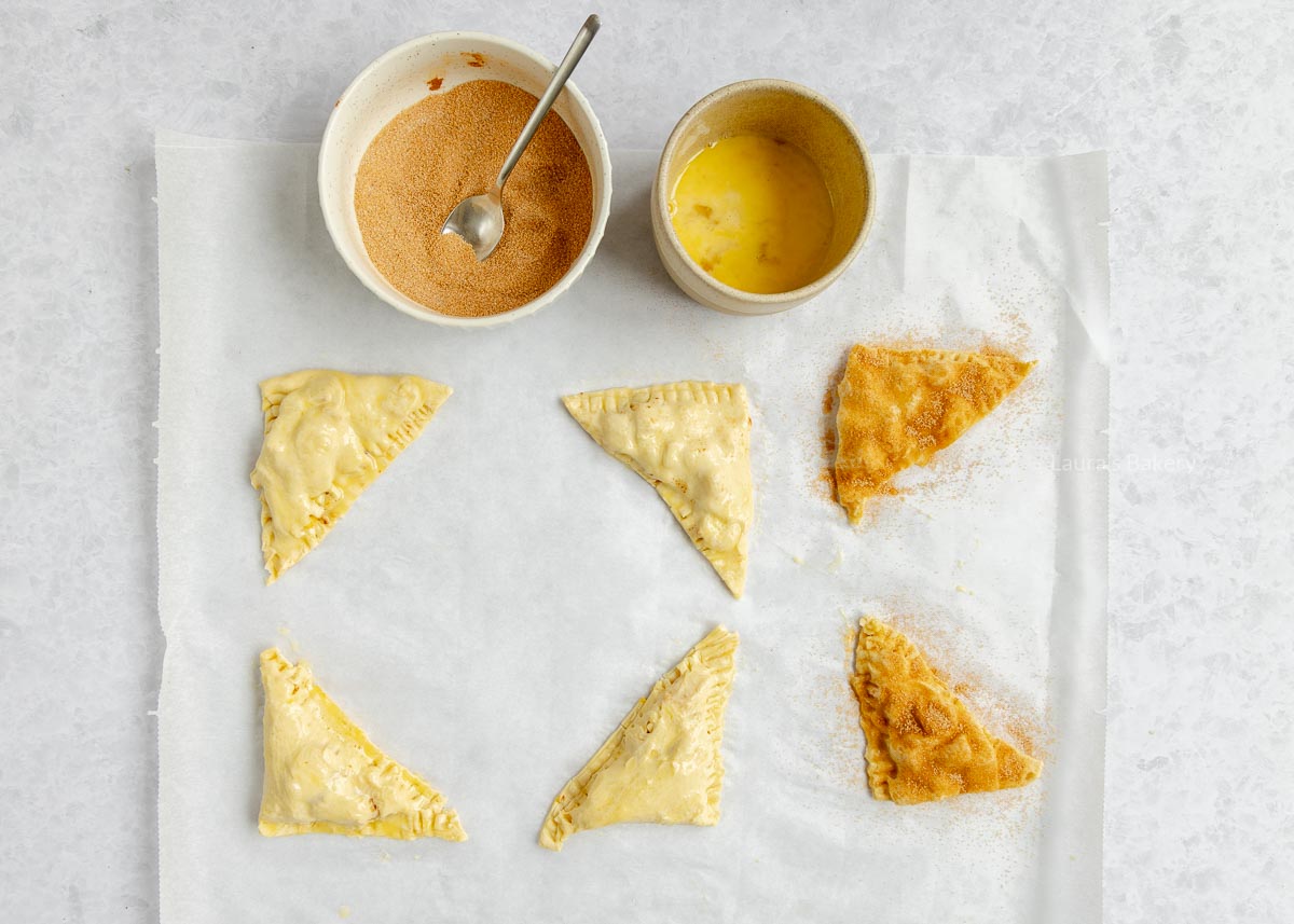 Dat kan, maar de onderkant van de appelflap zal waarschijnlijk meer karamelliseren. Bestrijk dan ook beide kanten met ei.