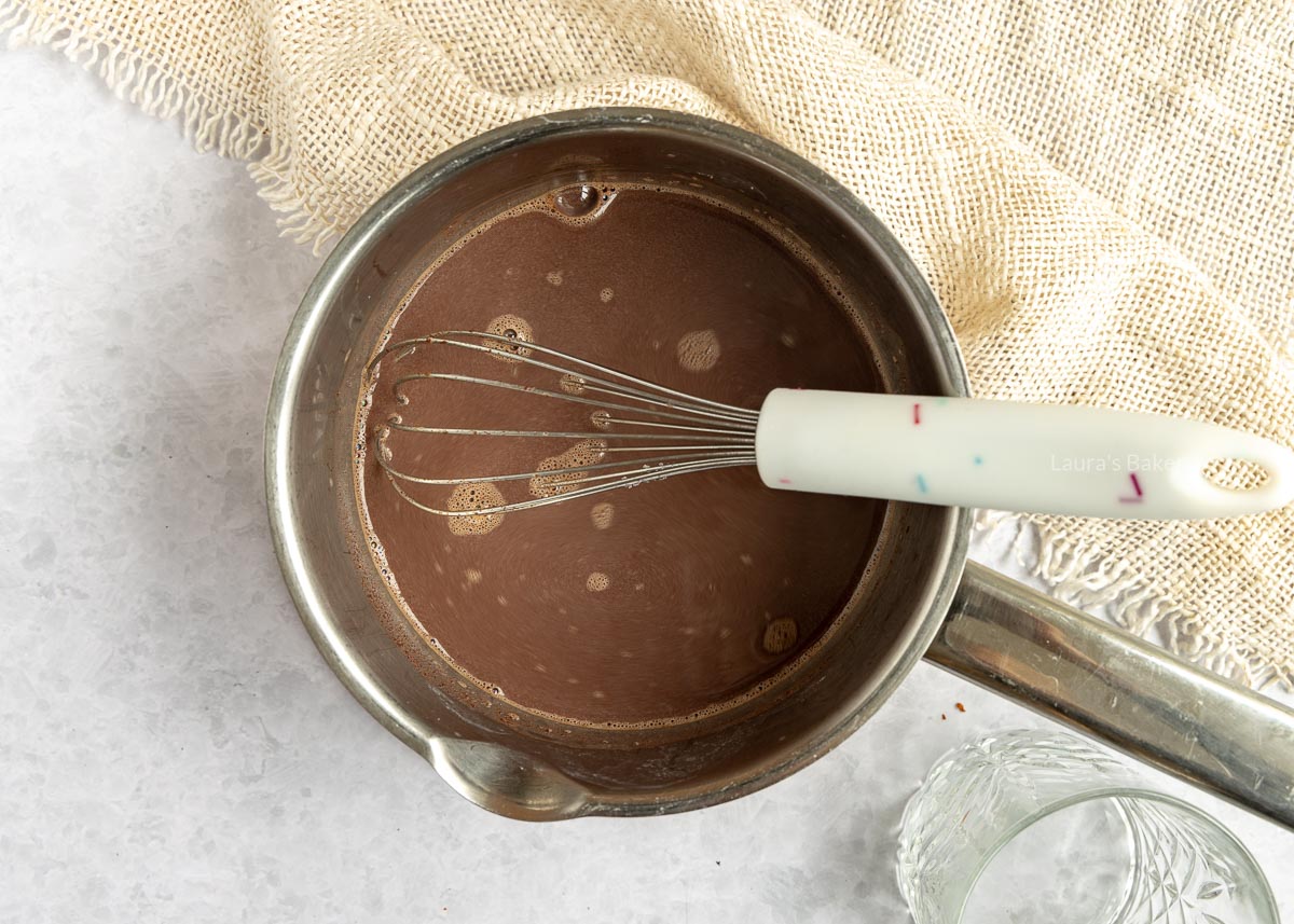 Nadat je een scheut hete melk bij het cacapoeder giet, meng je het zo snel mogelijk tot een papje zonder klontjes. Dit vind ik het beste werken met een kleine garde.