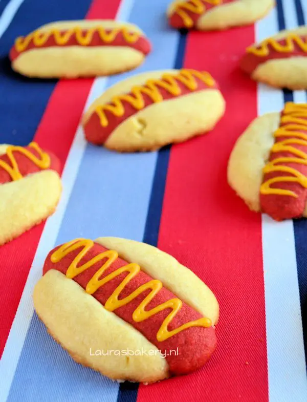 Ooit werd ik eens gewezen door een lezeres op hot dog koekjes. Ik had er nog nooit van gehoord en besloot te zoeken op Google. Wat ik toen allemaal zag vond ik echt fantastisch leuk. Allemaal koekjes in de vorm van hot dogs. Ik heb ze zelf vrij simpel gehouden maar je kunt allerlei soorten zoet beleg toevoegen aan je hot dogs. Maak bijvoorbeeld uitjes van kokossnippers en ketchup van rode icing. Maak het zo leuk en gek als je zelf wilt!