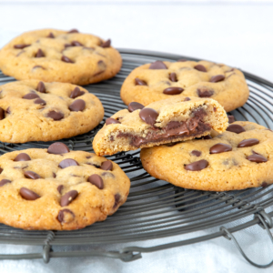 Het is alweer een half jaar geleden dat ik in de keuken stond voor mijn zoektocht naar de perfecte dikke chocolate chip koek. Toen ik dat basisrecept na meerdere testen eenmaal had uitgewerkt, ging ik de keuken in voor smaakvariaties door de koeken te vullen. Daaruit kwamen onder andere deze Nutella chocolate chip koeken. Chocolate chip koeken zijn sowieso al lekker zacht en smeuïg van binnen, maar deze chocoladevulling maakt dat nog net even beter. Ik deel het recept met je zodat je thuis ook aan de slag kunt met deze Nutella koeken.