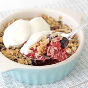 Het is geen geheim dat ik niet vies ben van een lekkere crumble. Sterker nog, als ik er eentje maak voor mijn blog eet ik ze als lunch. Een van die keren zat ik mij te bedenken dat ik ze zelfs als ontbijt zou kunnen eten, zo lekker vind ik ze. En je raadt het al, dat bracht mij op een idee. Ik ging een heuse ontbijt crumble maken! De vulling van fruit mocht uiteraard blijven, maar als topping gebruikte ik een zelfgemaakte granola die ik in de oven afbakte. Serveren met kwark en het feest is compleet.