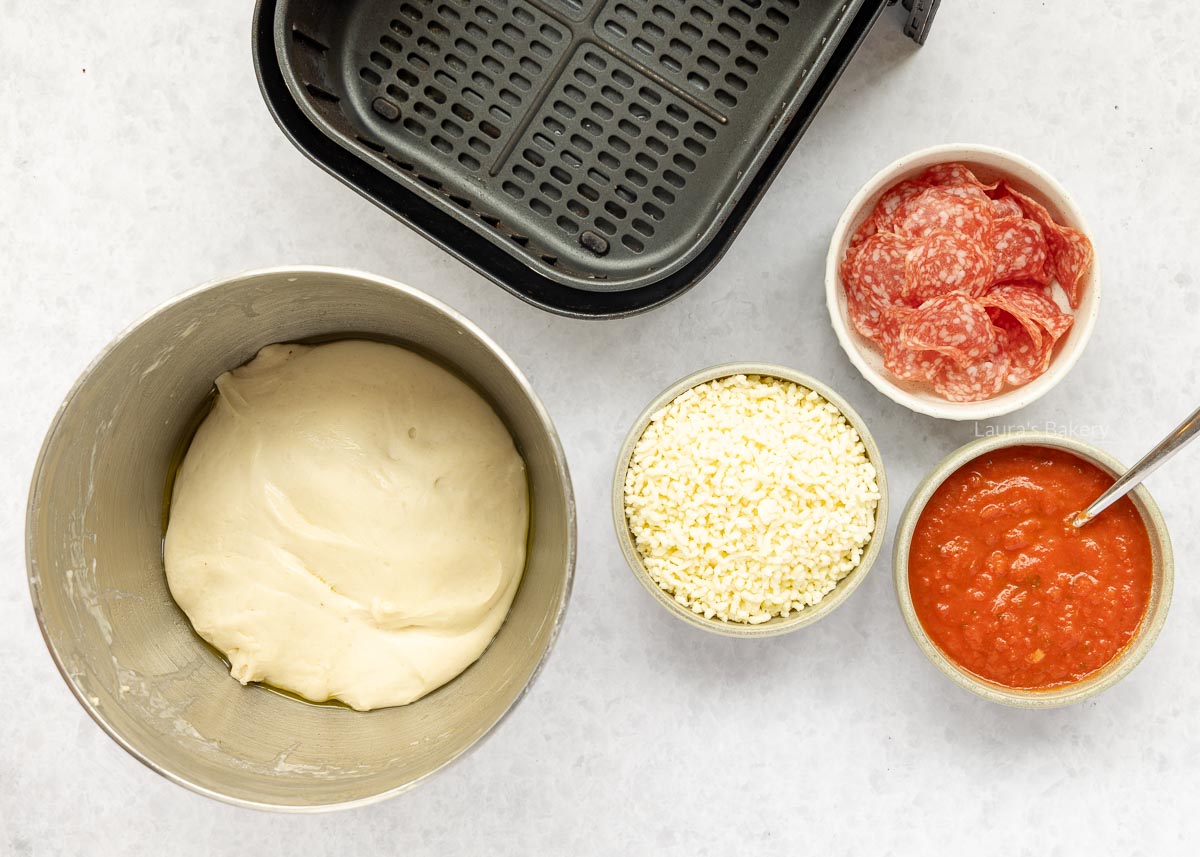 Bereid het deeg, zet alle ingrediënten klaar en verwarm de airfyer voor.