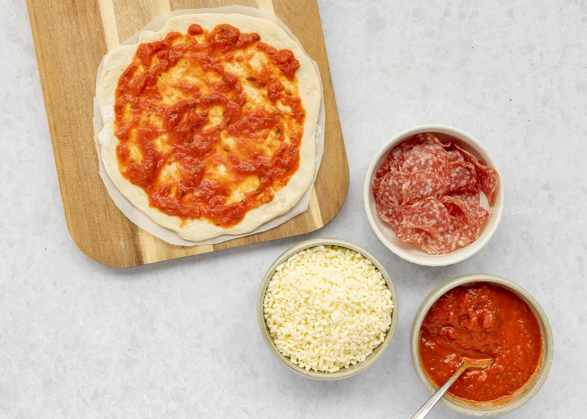 Als je de pizza’s wil voorbereiden, dan adviseer ik om enkel de bodem met tomatensaus te bakken. Bij het afbakken voeg je de toppings toe.