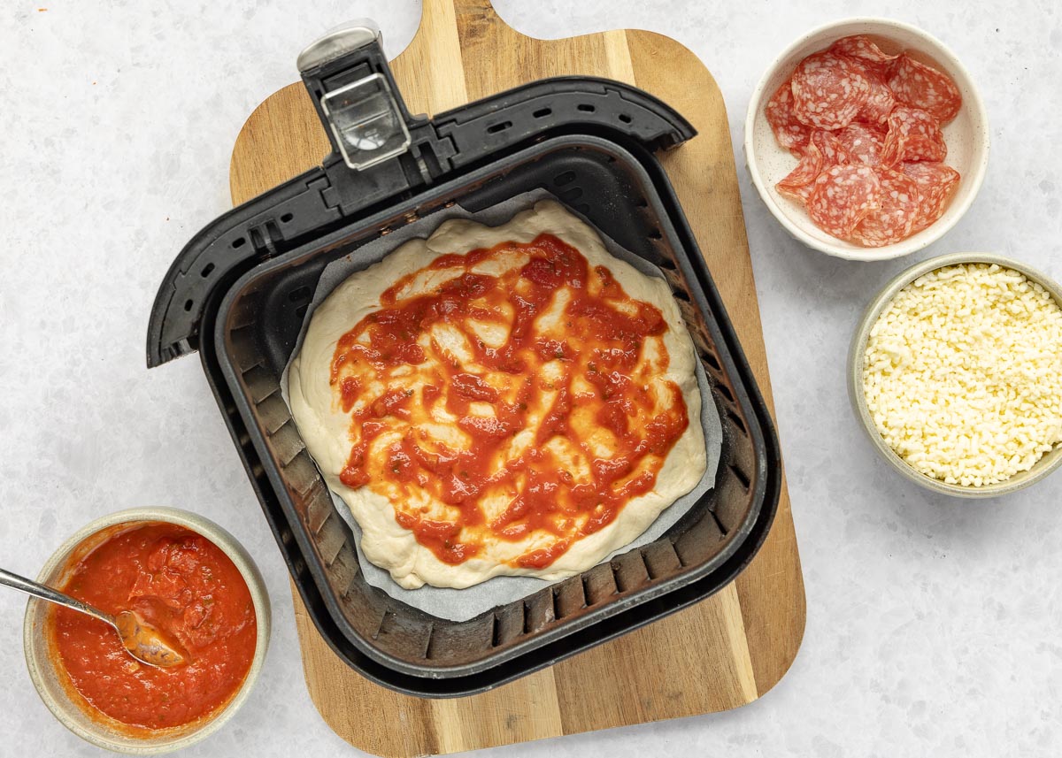 • Beleg de pizzabodems dun met tomatensaus en bak voor 8 minuten in de airfryer. Verwijder eventueel halverwege het bakpapier, anders gaart de bodem minder goed.