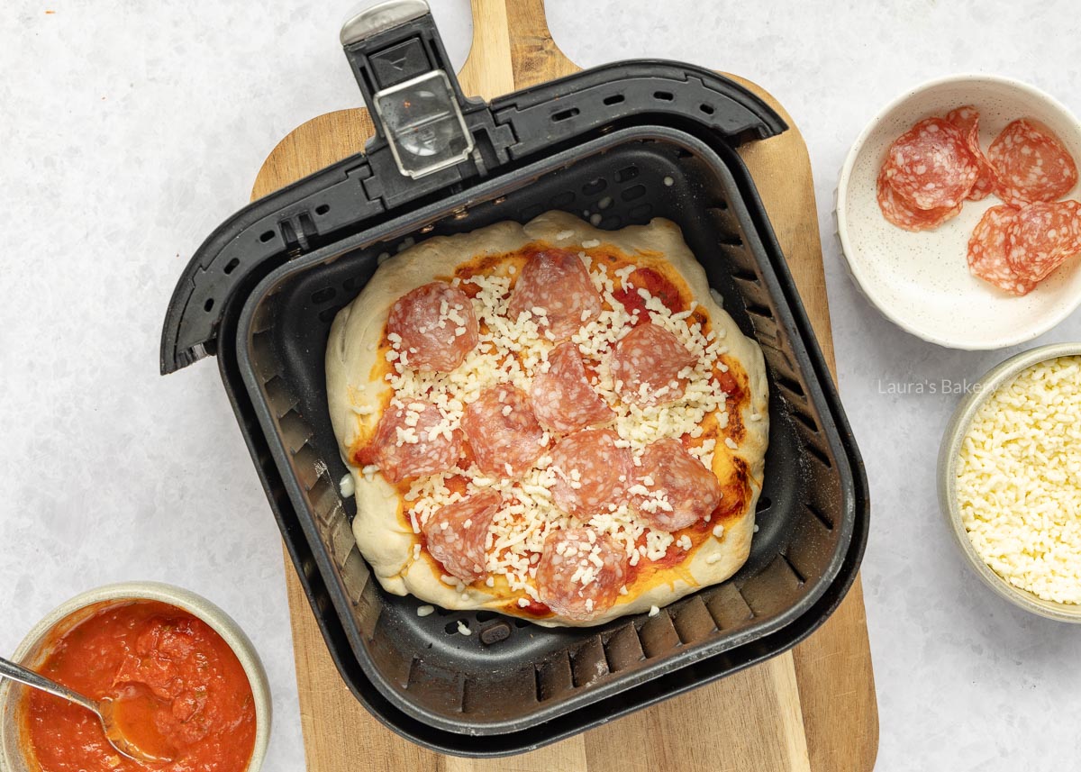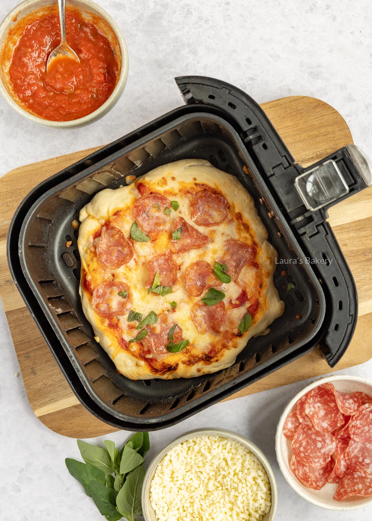 • Beleg daarna met toppings naar keuze, ik koos voor mozzarella en pepperoni. Bak nog 2-4 minuten in de voorverwarmde airfryer op 200 °C.