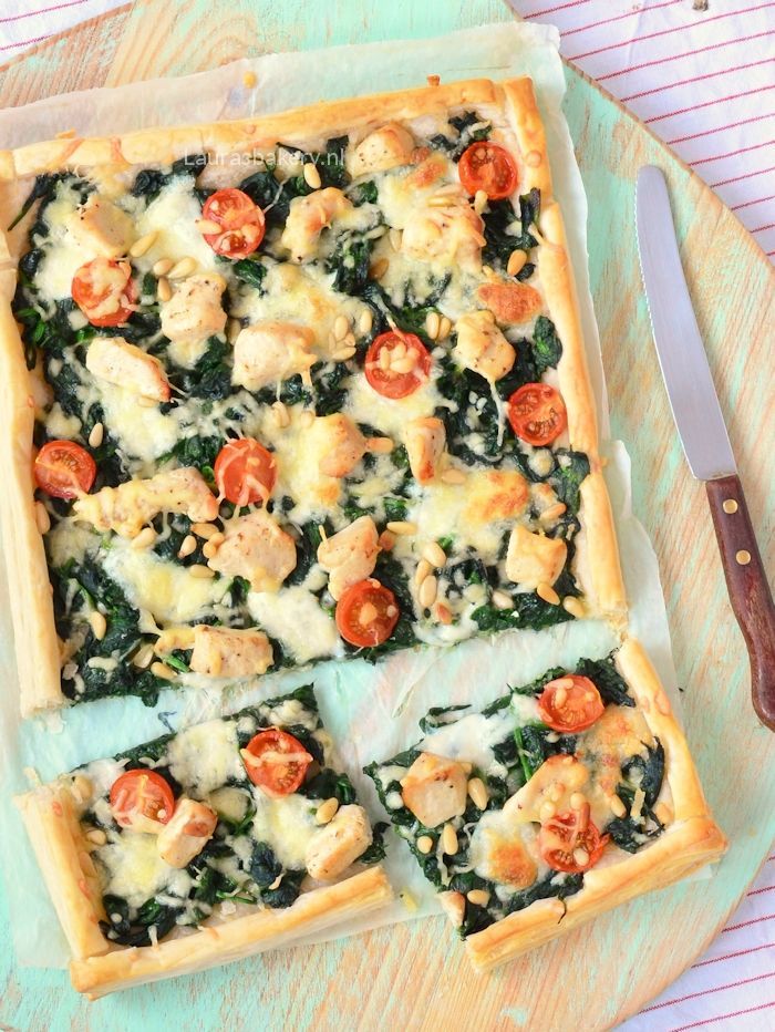 • Druk indien nodig het verdere vocht uit de spinazie en verdeel deze over de bladerdeeg bodem. Het is belangrijk dat de spinazie niet te vochtig is, anders gaart de bodem niet goed. Scheur de mozzarella in stukjes en verdeel over de taart. Voeg nu ook de stukjes kip en gehalveerde tomaatjes toe. Als laatst strooi je er wat geraspte kaas en pijnboompitjes over.