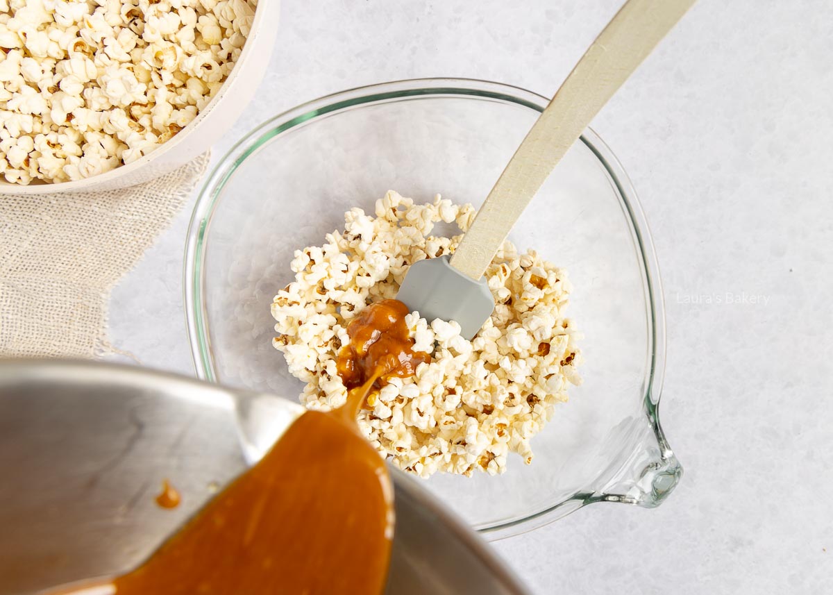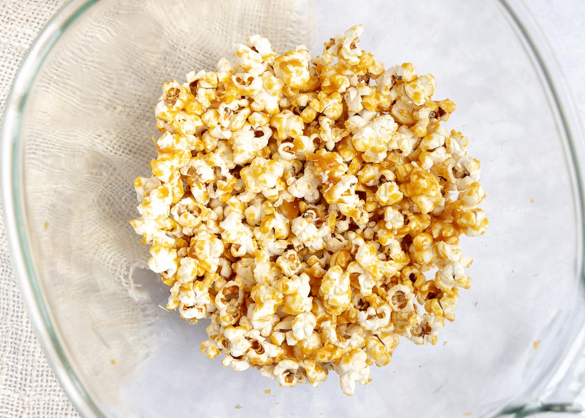 Ik heb hét trucje gevonden; de karamel in een heel grote pan, dan de popcorn er in 3 porties doorheen mengen (dan krijg je overal een klein beetje op), na het door de pan roeren uitstorten op een ovenplaat en 20 minuten op 100graden in de oven…. ontzettend lastig om te wachten, maar het is echt waard!