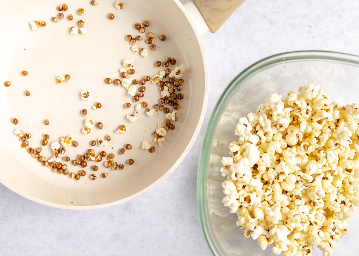 Om zelf zoete popcorn te maken met zo’n lekker knapperig suikerlaagje, maak je met boter en suiker een simpele gekaramelliseerde suikersiroop en dit meng je door de gepofte maïs.