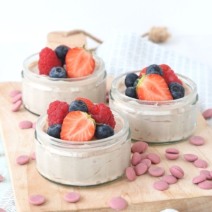 Je hebt het vast meegekregen de afgelopen weken: er is een nieuwe soort chocolade op de markt. En dan heb ik het niet over een reep met een nieuwe smaakcombinatie, er is namelijk echt een hele nieuwe smaak (en kleur!) chocolade gemaakt. Naast wit, melk en puur is er nu ook Ruby chocolade. Die chocolade is van nature roze en de smaak is ook heel bijzonder, het doet denken aan rood fruit en hij is lekker romig. Daar is niets kunstmatig aan zoals velen denken. Deze smaak en kleur zijn ontstaan door de gebruikte cacaobonen op een andere manier te bereiden. Hoe dan exact houden ze natuurlijk geheim, maar ik kan je wel vertellen dat het erg lekker is. Van Chocolaterie Pierre kreeg ik een zak met deze chocolade om te proeven en wat lekkers mee te maken. Ik ging voor een Ruby chocolademousse met rood fruit. Dat combineert namelijk heel erg goed in smaken. De chocolademousse is zonder ei, en dus ook geschikt voor kleine kinderen en zwangere vrouwen.