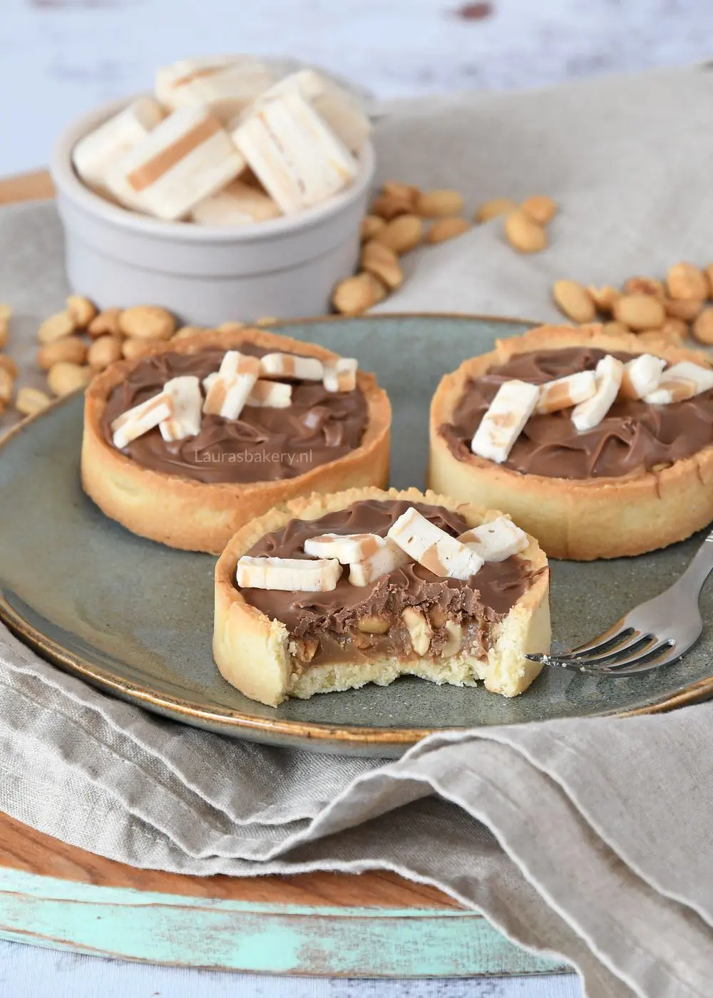 Soms heb je een geweldig idee waar je gelijk aan begint, andere keren duurt het nog een paar maanden voor je het plan uitvoert. Deze Snickers tartelettes behoren tot die laatste categorie. Ik bedacht ze eind juni op de boot naar Newcastle en zou ze voor mijn verjaardag maken. Toen had ik ineens meer zin om cakes te bakken, dus werden deze tartelettes weer eens opgeschoven. Afgelopen week ging ik dan eindelijk aan de slag. Na de koekbakjes gebakken te hebben maakte ik de vulling van karamel en pinda’s, smolt chocolade voor de topping en sneed blokjes nougat klein voor de decoratie. Alle elementen van een Snickers in een tartelette, zálig. Ik heb het recept gelijk voor je uitgewerkt zodat je zelf aan de slag kunt.